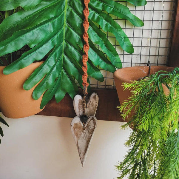 Encante seu jardim suspenso com este pingente de macramê elaborado com o nó DNA. Com peças em madeira em formato de coração e uma argola de madeira, é a adição perfeita para trazer charme e...
