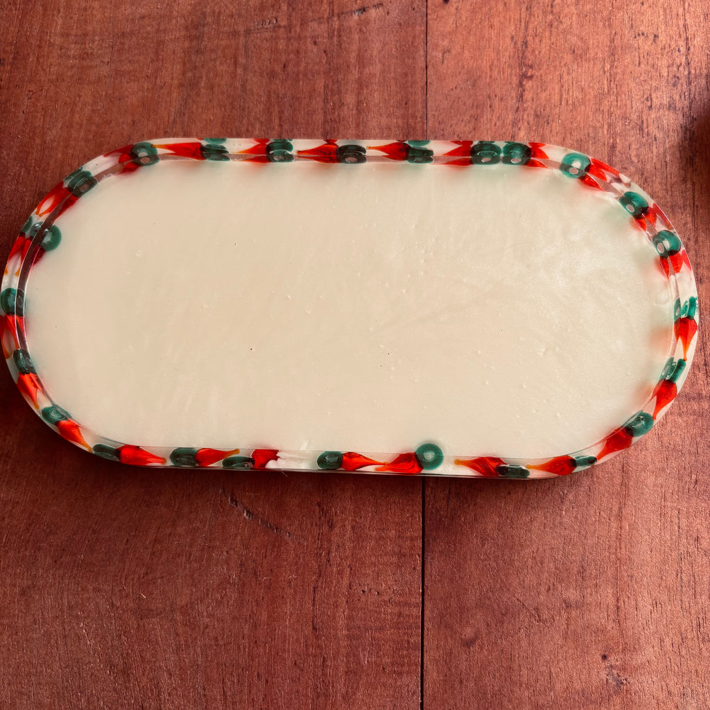 A bandeja de resina epóxi com proteção UV possui um peso leve de 216g e dimensões de 22,2x11,1x1,2 cm, trazendo o diferencial de pimentas de vidro cuidadosamente selecionadas para cada peça. Ideal para adicionar charme e proteção a qualquer ambiente.